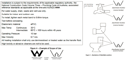 2019年5月1日起[4] ,澳大利亚联邦政府建筑法规NCC实施新NCC 2019 Volume 3版本法规[4] 。建筑法规NCC第3部分- 管道规范PCA,规定了有关管道和排水类产品需要认证并且授权应用在管道或排水安装[5] 。