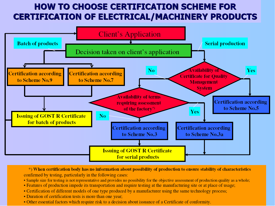 As stated previously, a manufacturer who wants to sell his products in Russia must have a GOST R certificate. In principle, the certificate will be valid for three years. Certification is based upon testing at accredited laboratories using GOST R standards. Russian standards are more and more on IEC and ISO standards. The harmonization process is continuously on-going but it will take a lot of time. Manuals must be written in the Russian language.For each certification system, different schemes are applied. These schemes regulate which conformity assessment procedures that shall be used, including forms for follow-up.An ISO 9000 certification by an organization accepted by Gosstandart will in most cases be an advantage and should be mentioned in the application. Gosstandart registers all certificates. The certificate holder must also buy a number of authorized certificate copies, since all retailers must be able to show a copy upon request. As stated before, a certificate copy for each type must be included in the transport documentation for all shipments into Russia.