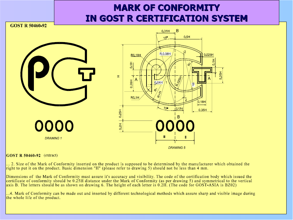 According to GOST R 50460-92, all products covered by the mandatory certification requirement shall be affixed to the product. If it is not technically possible to do so, the mark shall be affixed to the package or, as a last alternative, on the accompanying documentation. Audio/video products and IT products must carry certain counterfeit-proof compliance