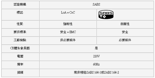 SABS (South African Bureau of Standards) 是以南非政府的名義來確保合法的規範有被遵循。只要是進口到南非的產品,都必須出示強制性安全制度的海關檢查信或是在產品上標示SABS 安全標誌。技術要求: 南非的電壓為220V/50Hz (某些地區是240V/50Hz)。插頭與英國的相似,且必須符SABS164-1:1997或是SABS 164-2:1997。有Class I 及Class II ,基本上針對不同的電壓一共有兩個商業用插頭: