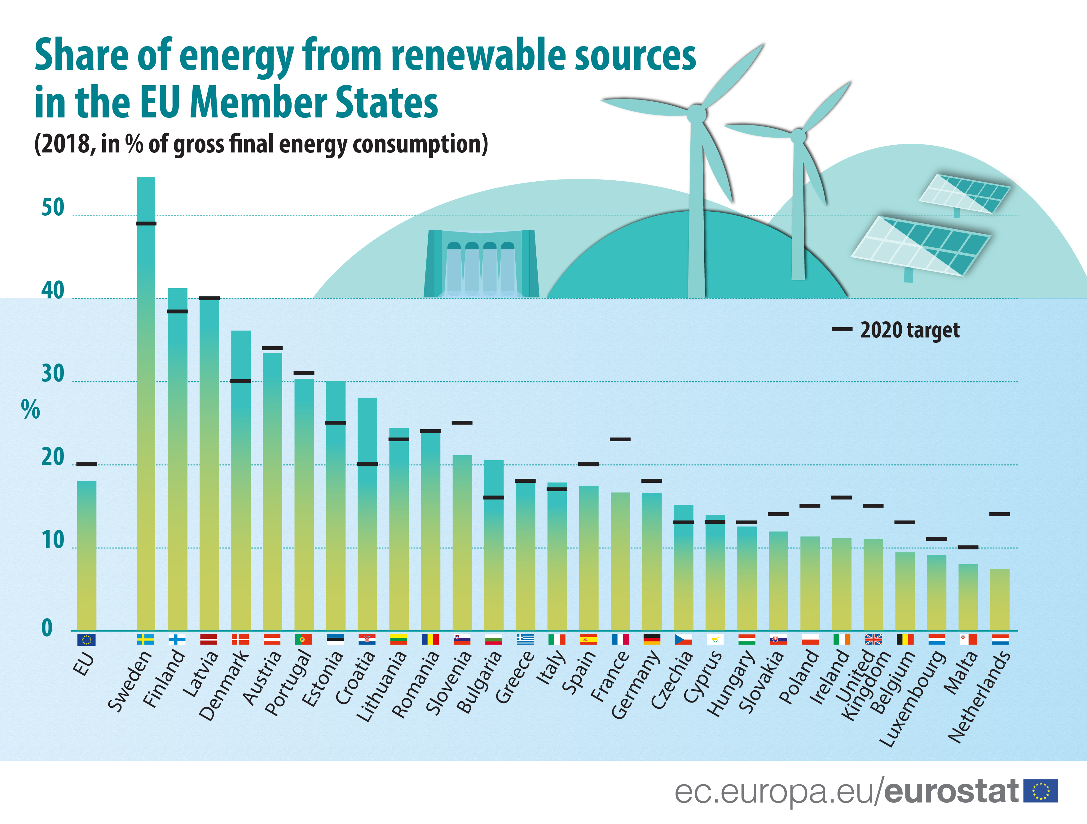 The original renewable energy directive (2009/28/EC) establishes an overall policy for the production and promotion of energy from renewable sources in the EU. It requires the EU to fulfil at least 20% of its total energy needs with renewables by 2020 – to be achieved through the attainment of individual national targets. All EU countries must also ensure that at least 10% of their transport fuels come from renewable sources by 2020. In December 2018, the revised renewable energy directive 2018/2001/EU entered into force, as part of the Clean energy for all Europeans package, aimed at keeping the EU a global leader in renewables and, more broadly, helping the EU to meet its emissions reduction commitments under the Paris Agreement.